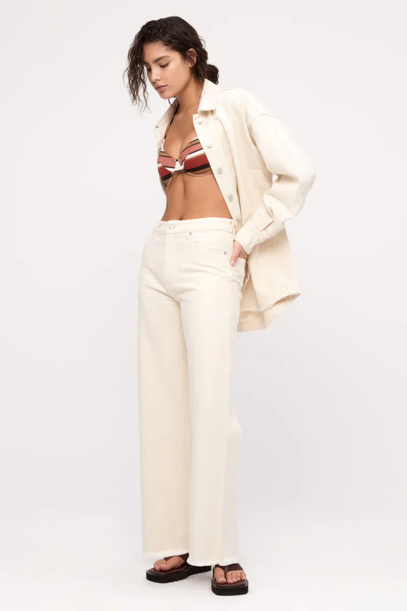 A relaxed fit shirt jacket silhouette, made from a soft organic cotton twill fabrication with a subtle fleck texture throughout. Featuring centre front button closure, traditional shirt cuff and front chest pocket, raw edge on hem.